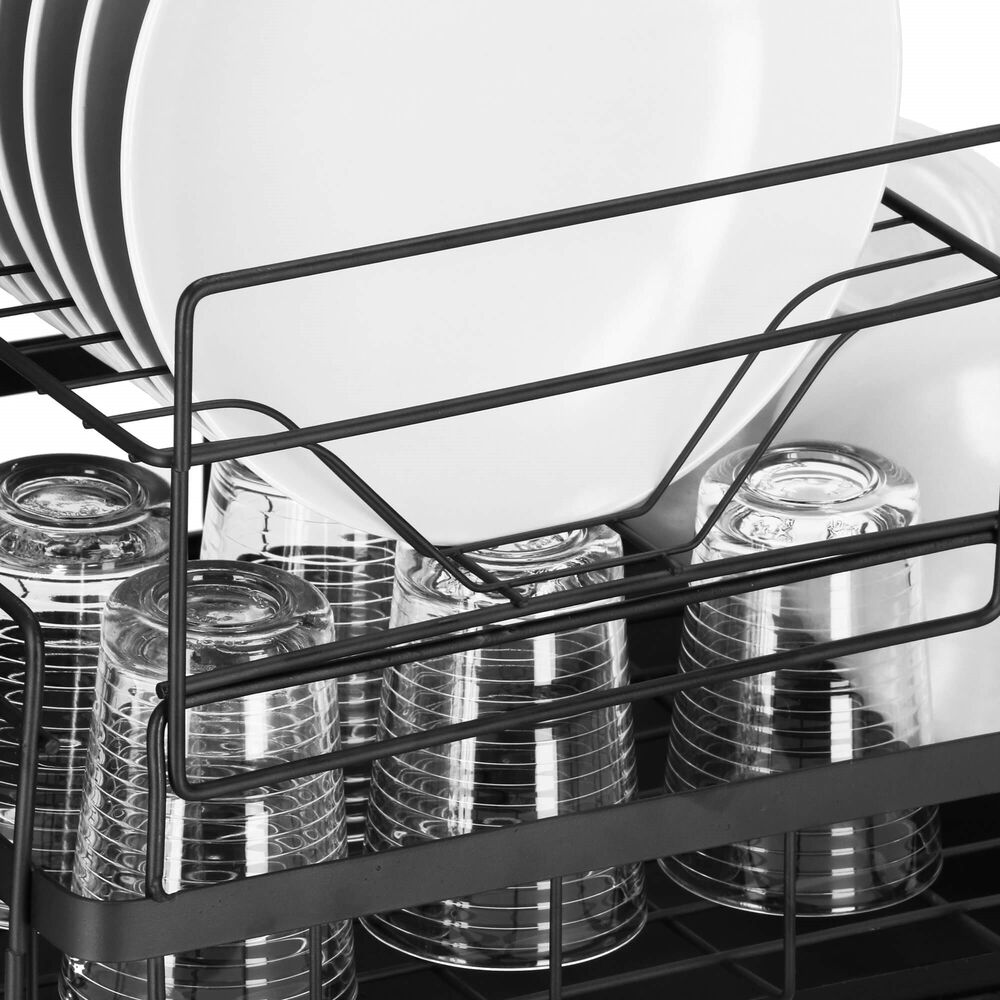 Díky dvoupatrovému provedení nabízí dostatek prostoru pro talíře, misky, sklenice i příbory, přičemž využívá vertikální uspořádání pro úsporu místa. Konstrukce z matné oceli s černým práškovým nástřikem dodává moderní vzhled a zajišťuje odolnost proti vlhkosti a korozi. Nerezový odkapávač s podnosem je doplněn o odnímatelný plastový podnos, který zachytává přebytečnou vodu a usnadňuje čištění.