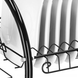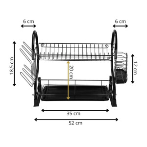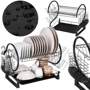 Díky dvoupatrovému provedení nabízí dostatek prostoru pro talíře, misky, sklenice i příbory, přičemž využívá vertikální uspořádání pro úsporu místa. Konstrukce z lesklé oceli s černým práškovým nástřikem dodává moderní vzhled a zajišťuje odolnost proti vlhkosti a korozi. Nerezový odkapávač s podnosem je doplněn o odnímatelný plastový podnos, který zachytává přebytečnou vodu a usnadňuje čištění.