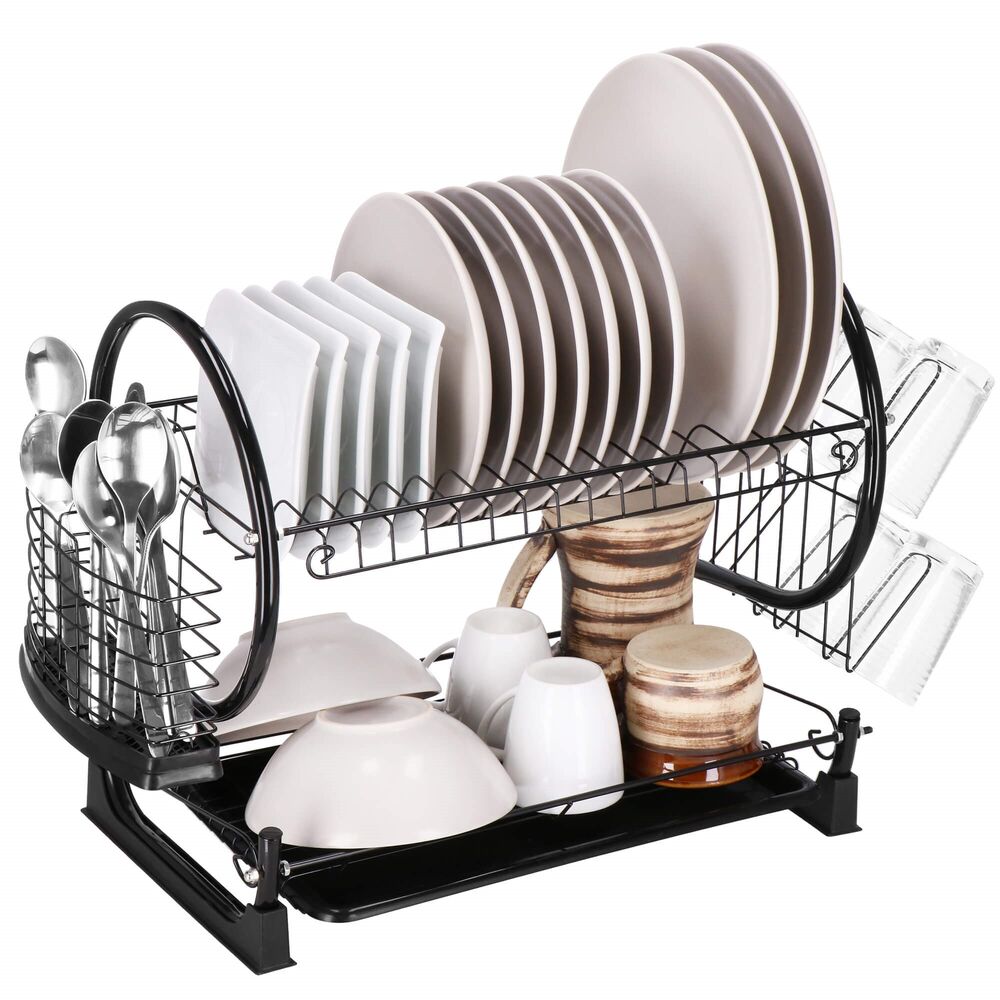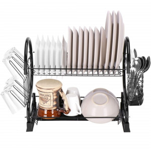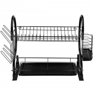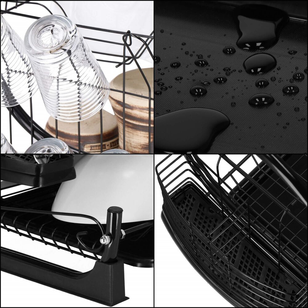 Odkapávač na nádobí nabízí víceúrovňové sušení díky praktickému dvoupatrovému provedení. Nerezový odkapávač s podnosem z lesklé oceli s černým práškovým nástřikem zaujme luxusním designem. Odnímatelný plastový podnos zachycuje vodu, zatímco přihrádka na příbory a držák na prkénka nebo sklenice usnadňují organizaci. Odkapávač se snadno čistí a poskytuje velkou kapacitu.