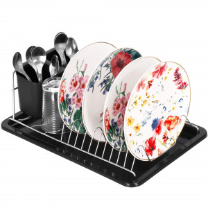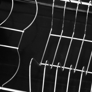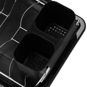 Jeho chromovaná ocelová konstrukce zajišťuje pevnost a odolnost, zatímco odnímatelný plastový podnos pro zachycení vody brání vzniku nepořádku a udržuje okolní plochu suchou. Součástí jsou také dvě odnímatelné plastové přihrádky na příbory, které umožňují snadné oddělení a uspořádání menších kuchyňských potřeb.