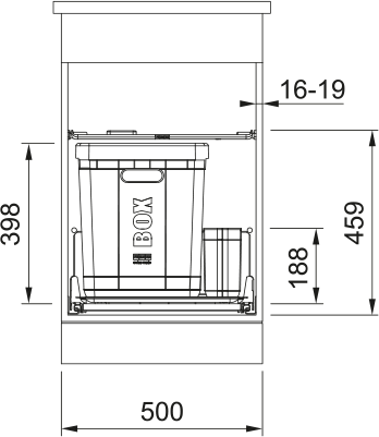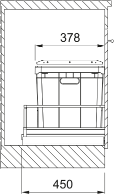 Plastový koš 40 l (Možnost umístit i 2 sáčky) + 1 Boční koš. Barva černá. Police nad košem v ceně koše. Police obsahuje aktivní uhlíkový filtr, který pohlcuje nepříjemné pachy. Koš se vkládá do zásuvky s plnovýsuvem, která je osazena podélným relingem nebo vysokou bočnicí. Doporučené plnovýsuvy BLUM, GRASS, HETTICH.