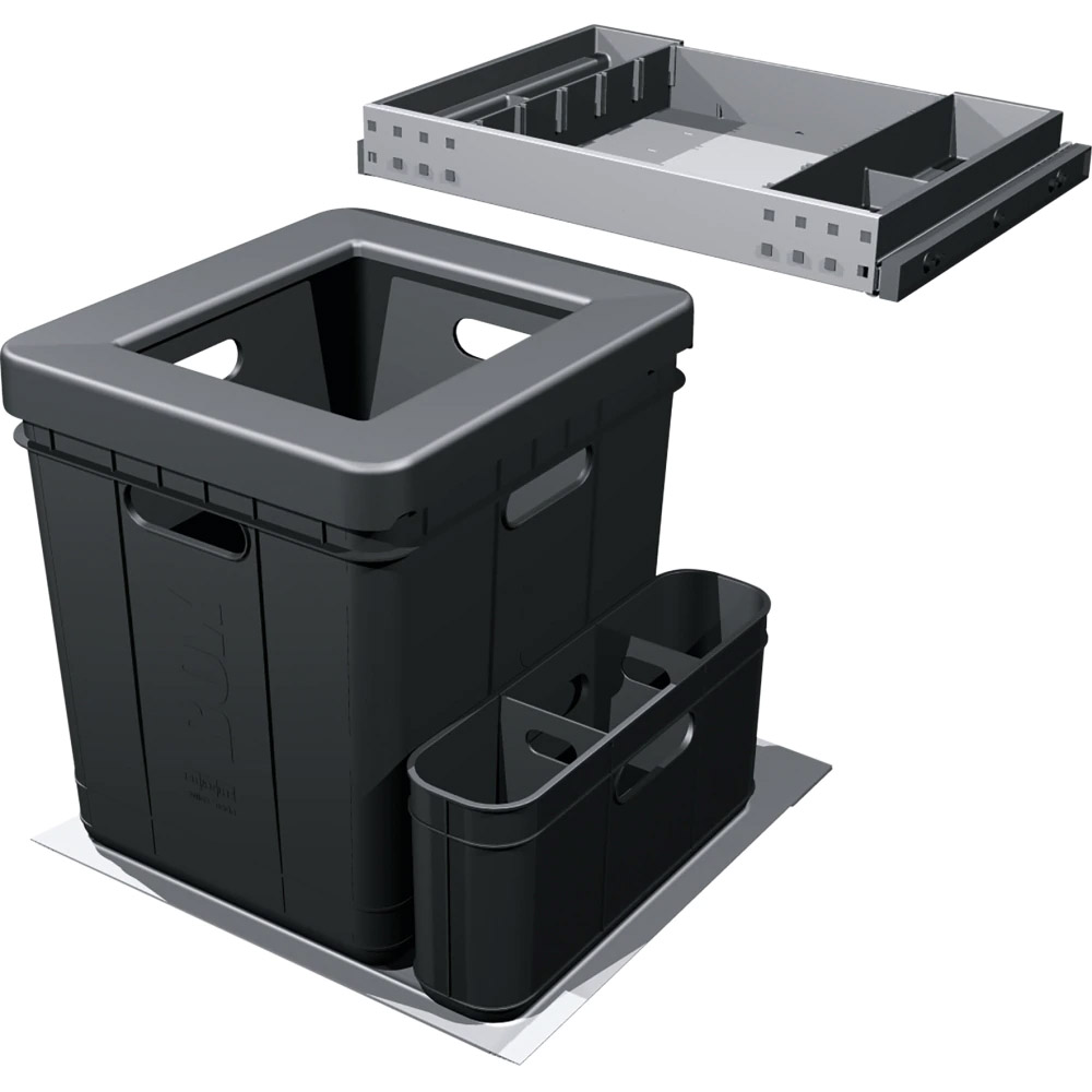 Dotaz na produkt Na splátky ještě dnesPlastový koš 40 l (Možnost umístit i 2 sáčky) + 1 Boční koš. Barva černá. Police nad košem v ceně koše. Police obsahuje aktivní uhlíkový filtr, který pohlcuje nepříjemné pachy. Koš se vkládá do zásuvky s plnovýsuvem, která je osazena podélným relingem nebo vysokou bočnicí. Doporučené plnovýsuvy BLUM, GRASS, HETTICH.