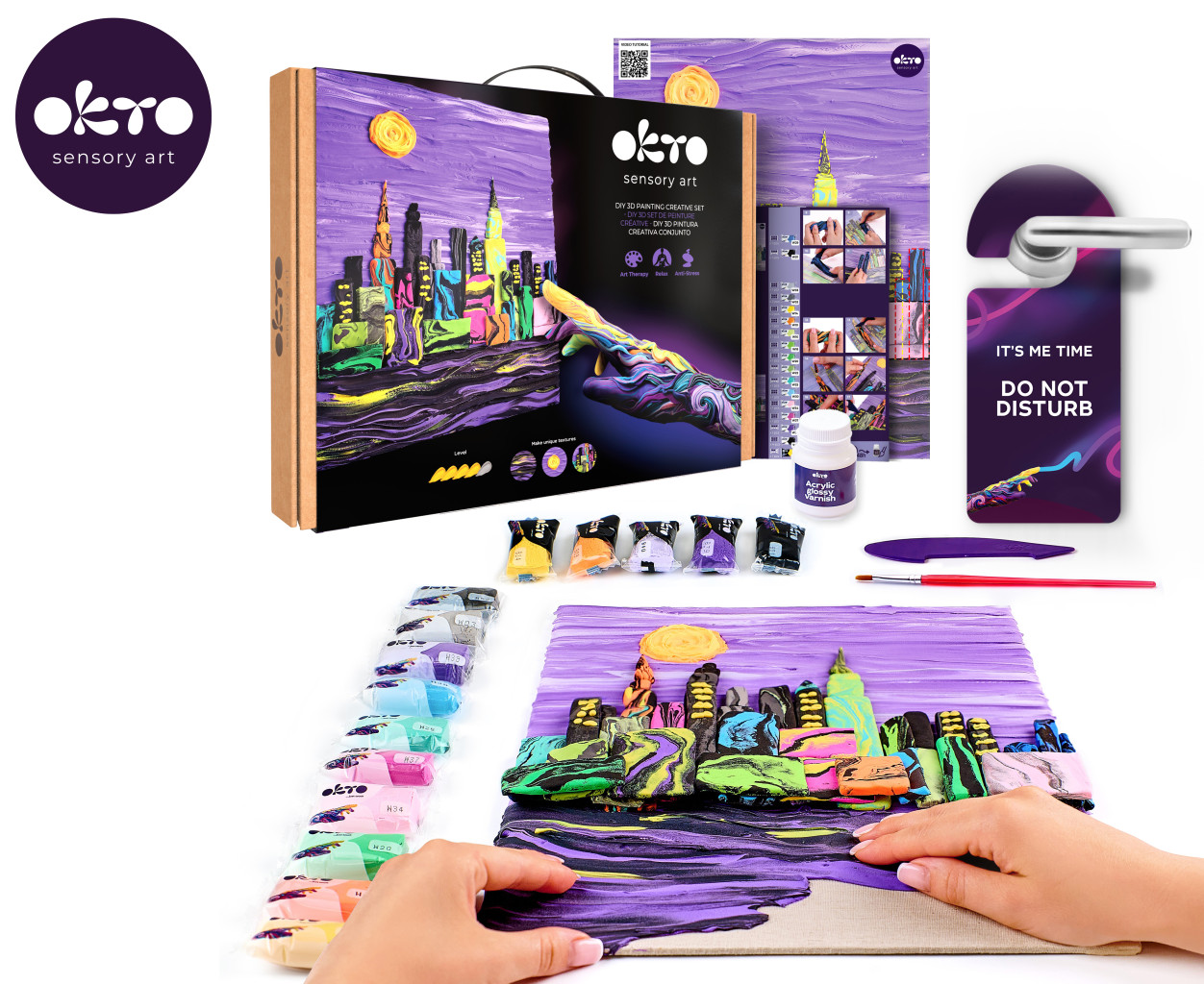 Dotaz na produktOKTO Malování hmotou motiv "#Skyline - New York". Velikost plátna 30x40 cm. Obtížnost 4/5. Obsah balení - přírodní plátno, obrázkový návod, modelovací nástroj, sada samoschnoucí modelovací hmoty, akrylový lak 20 ml, štětec.