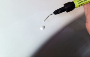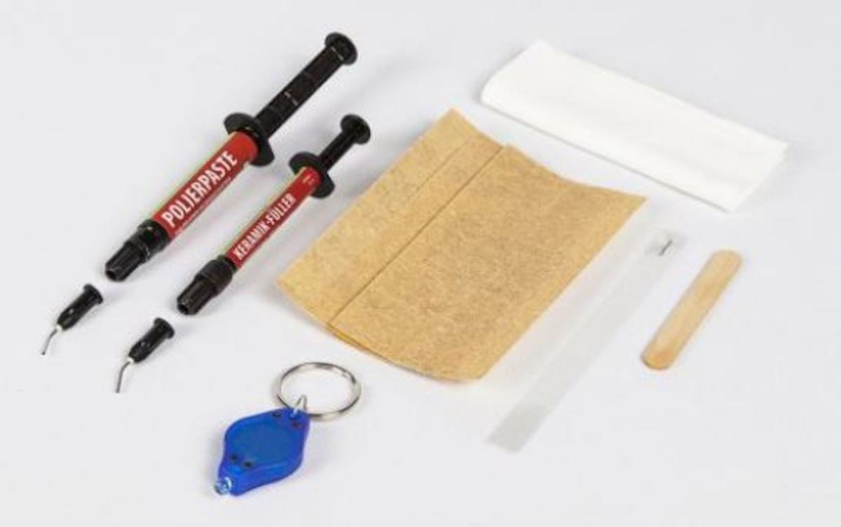 Příprava a čištěni: Odstraňte volné a přesahující nečistoty. Povrch očistěte, vysušte a odmastěte. Tip: Vyčistěte lihem nebo ředidlem. Zabarvené hrany odstraňte brusným papírem nebo vyčistěte (zubním) kartáčkem. Vyplnění: Sejměte černé víčko z náplně keramického tmelu. Nasaďte pevně mikrošpičku (kanylu). Tmel naneste do místa poškození, o něco více než je třeba. Příprava před vytvrzením: Na vyplněné místo přiložte proužek průhledné fólie. Dřevěnou špachtlí přes fólii vyhlaďte tmel do hladka. Dbejte na to, aby se nevytvořily pod fólií vzduchové bubliny, případně je vyhlaďte. Vytvrzení: Zapněte Mini-LED-lampičku jejím stlačením uprostřed nebo malým spínačem. Vyplněné místo osviťte max. ze vzdálenosti 1 cm po dobu 2 - 3 minut, tím dojde k vytvrzení tmelu. Doba osvícení závisí na hloubce výplně. Upozornění: Nedívejte se přímo do světla lampičky, může vyvolat trvalé poškození očí. Odstranění fólie: Po vytvrzení tmelu odstraňte proužek fólie. Zbroušení přesahu: Vytvrzený přesahující tmel lehkým a krouživým pohybem obruste. Upozornění: Při broušení příliš netlačte, abyste nevytvořili prohlubeň. Opravené místo musí být hladké bez okrajů. Leštění: Sejměte černé víčko z náplně leštící pasty. Nasaďte pevně mikrošpičku (kanylu). Naneste pastu na opravené místo a bavlněným hadříkem lehkým krouživým pohybem vyleštěte do stejného lesku jako má okolní povrch. Čistění. A je to! Zbytky leštící pasty setřete suchým a čistým hadříkem. A je to!