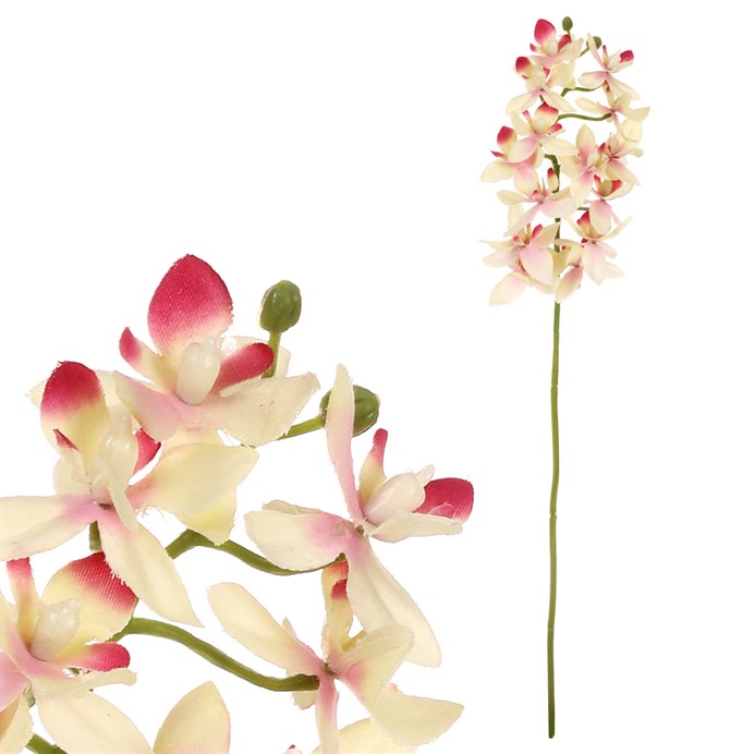 Dotaz na produktUdělejte si radost pořízením nevadnoucí krásy v podobě umělé řezané květiny a oživte svůj interiér, či jiné zvolené místo, nádhernými květy a barvami. Nechť je právě tato drobnokvětá orchidej se žluto růžovými květy významným bodem pro vaší vytouženou výzdobu. Variant použití je mnoho a je jen na fantazii každého z nás, k čemu tuto umělou dekoraci použije. Můžeme ji nechat vyniknout třeba v krásné váze na viditelném místě, nebo vytvořit s dalšími druhy nádhernou kompozici. Naše široká nabídka umělých řezaných květin totiž nabízí nepřeberné množství možností, ze kterých si vybere každý dle svého vkusu či události, pro kterou je určena. Pokud hledáte oživení vybraného místa přírodním půvabem a barvami, ale zároveň nemáte možnosti, jak se starat o živé rostliny, bude právě tato umělá květina pro vás ideální volbou.