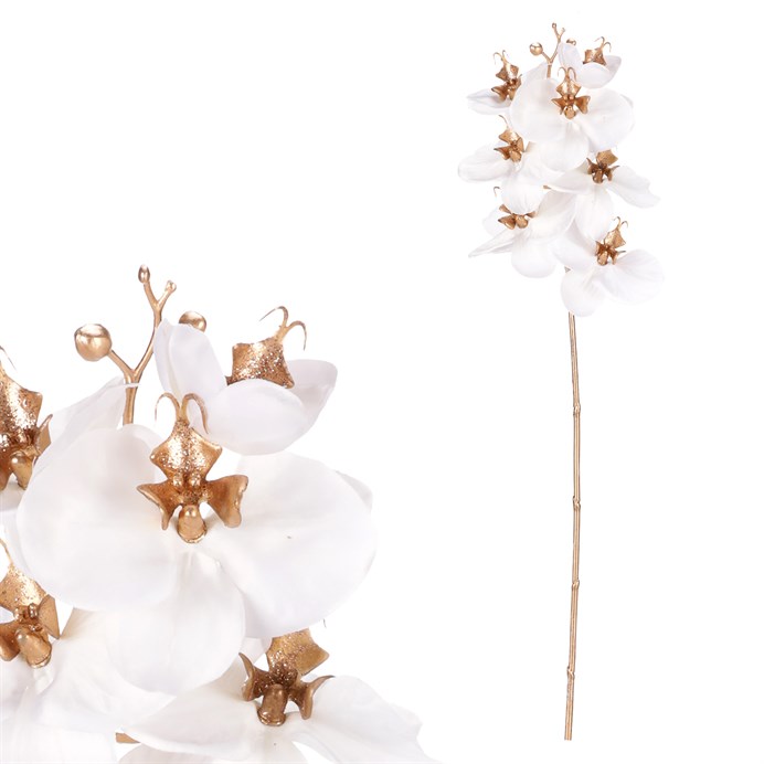 Dotaz na produktRádi byste osvěžili vaši vánoční výzdobu novou květinovou dekorací, která vypadá působivě, dlouho vydrží a zároveň je svým barevným pojetím vhodná pro takové období? Elegantním řešením bude právě bílé orchideje se zlatým zdobením, která obohatí sváteční interiér svým originálním provedením a dekorem. Je skvělé, že tato nádherná umělá rostlina nikdy neuvadne a může přinášet potěšení svým půvabem ve stejné intenzitě každý rok. Nechte ji vyniknout třeba v krásné váze na svátečně prostřeném stole, či jiném viditelném místě, kde bude vynikat a dělat radost vám i vašim návštěvníkům. Naše nabídka zahrnuje mnoho dalších umělých květin v závislosti na druhu a barvě, což umožňuje nepřeberné množství variant pro aranžování, a tudíž je jen na fantazii a vkusu každého z nás jaké si vybere.