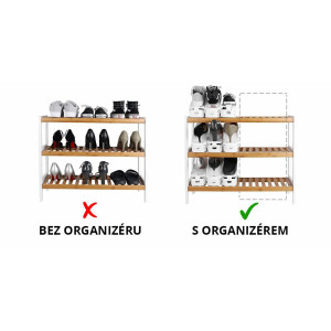 Držák na boty byl navržen tak, aby na něj bylo možné umístit jakýkoli typ obuvi. Tříúrovňové nastavení výšky horní části umožní výšku cca 10 cm, cca 14 cm a cca 18cm. Díky tomu na organizér uspořádáte jak žabky, sportovní obuv, tak podpatky.