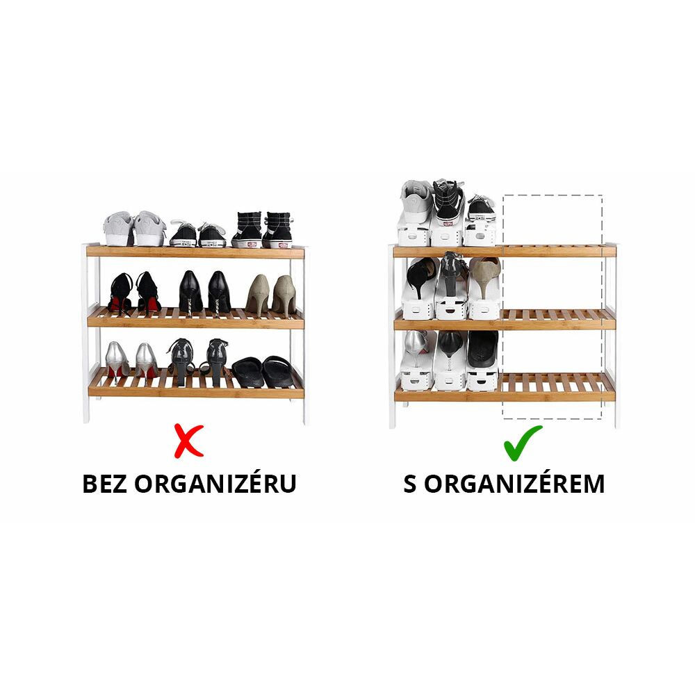 Při snaze dát všechny boty do šatníku někdy nastane problém - nedostatek místa. Díky organizérům na boty se toho nemusíte bát. Spousta bot, spousta velikostí. Díky možnosti umístění bot na horní i spodní platformu ušetříte až 50 % místa ve vašem šatníku.
