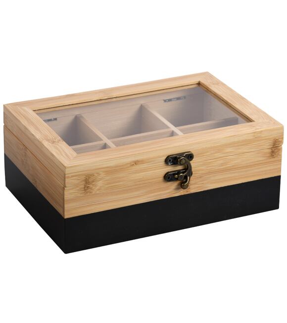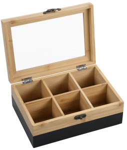 Dotaz na produktOrganizér na čaje, 6 přihrádek, 21,5 x 15 x 8,5 cm, bambus, černý KESPER