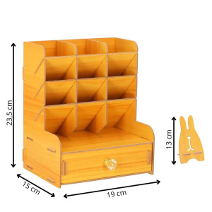 Dřevěný organizér na stůl s velkým úložným prostorem. Vyrobeno z pevného přírodního materiálu, je zárukou odolnosti a zajišťuje mnoho let používání. Má 9 přihrádek, polici a výsuvnou zásuvku. Elegantní přesto promyšlený design, stabilní konstrukce. Pomůže vám s organizací místa a tím zlepší efektivitu práce.