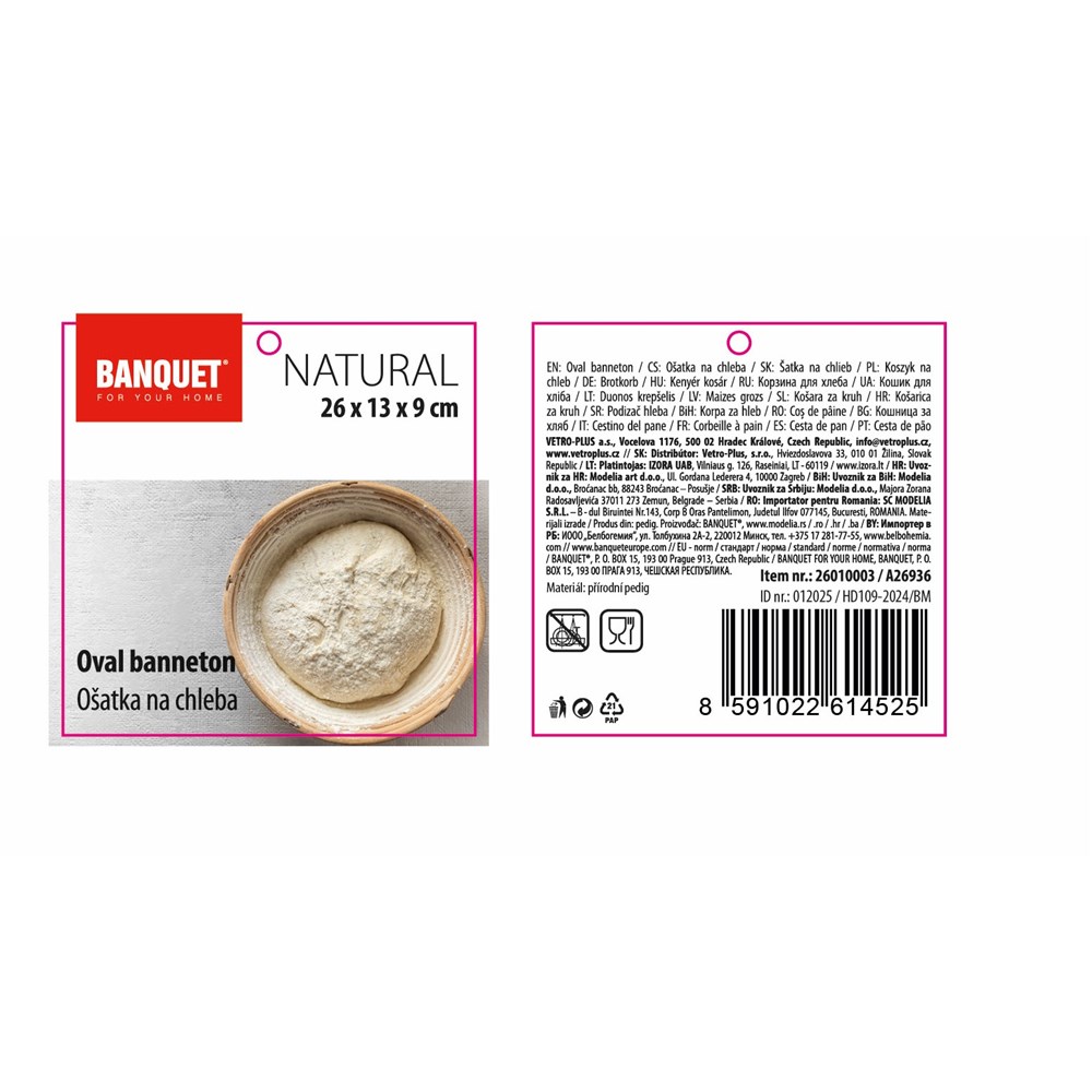 Dotaz na produktOválná ošatka z přírodního pedigu s dekorem klasu o rozměru 26 x 13 x 9 cm je určena na kynutí chleba. Po použití se doporučuje ošetřit pouze vlhkým hadříkem.