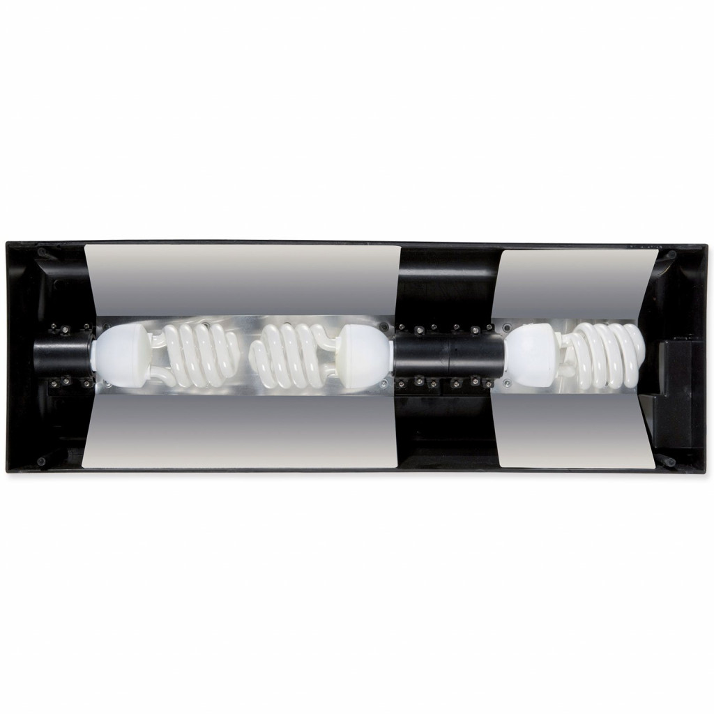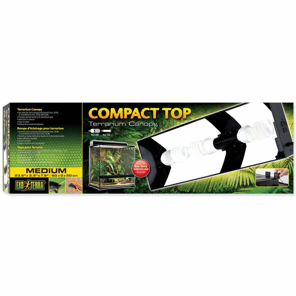 Tento kryt je jednoduchý na instalaci a pro použití 3 kompaktních žárovek. Speciální drážky na horním krytu dovolují používat speciální doplňky jako je Exo Terra digitální vlhkoměr a teploměr nebo termostat a vlhkostat (vše prodáváno zvlášť).