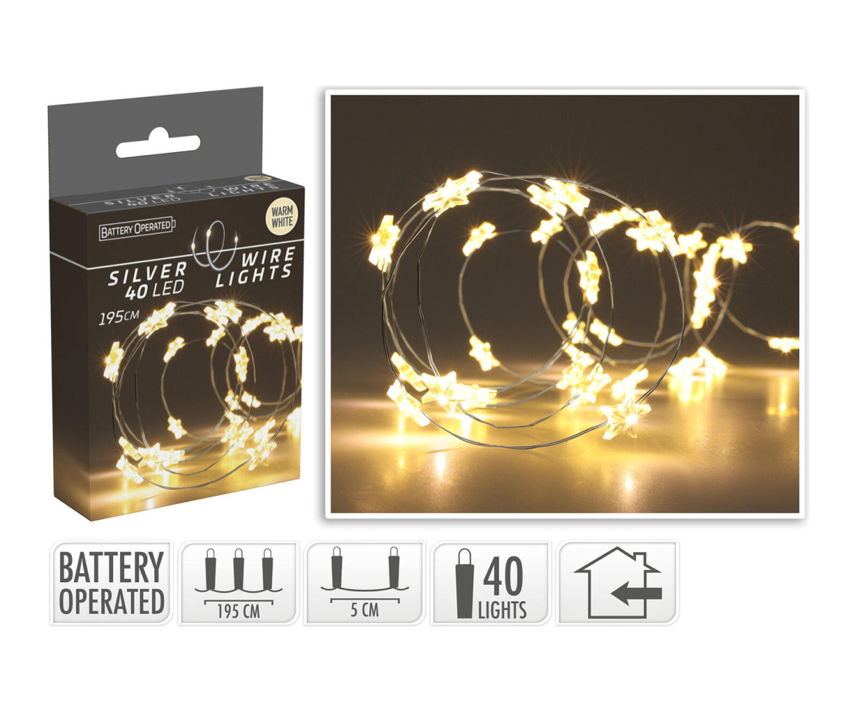 Dotaz na produktOsvětlení vánoční 1,95 m, 40LED, teplá BÍ, drát, HVĚZDY.