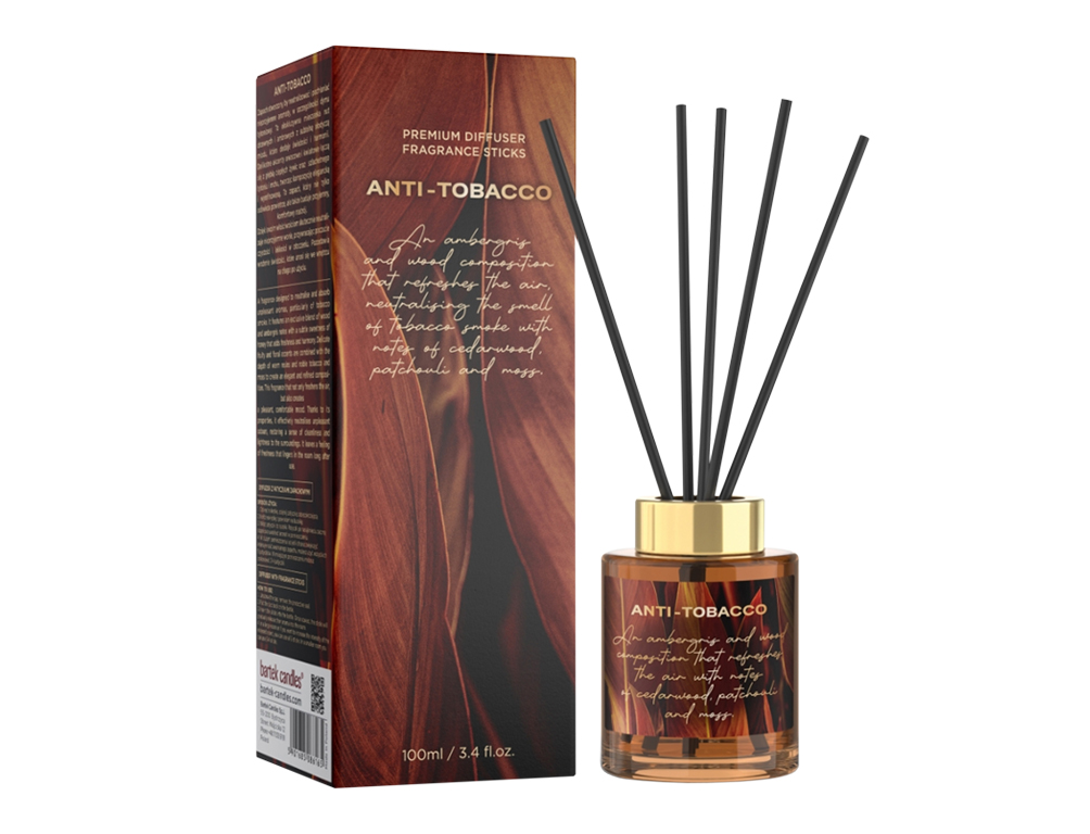 Dotaz na produktOdpařovací osvěžovač vzduchu s tyčinkami určený k neutralizaci nepříjemných pachů, zejména tabákového kouře. Hřejivá ambrovo-dřevitá kompozice spojuje tóny švestky a karamelu s nádechem cedrového dřeva, pačuli a vanilky, doplněné jemnou stopou tabáku a mechu. Výsledkem je kultivovaná, plná vůně, která prostor nejen provoní, ale zároveň účinně pohlcuje nežádoucí aroma a navozuje pocit čistoty a pohodlí. Intenzitu lze regulovat počtem vložených tyčinek. Vůně vydrží až 6 týdnů v závislosti na podmínkách prostředí. Objem: 100 ml. Barva: hnědá.