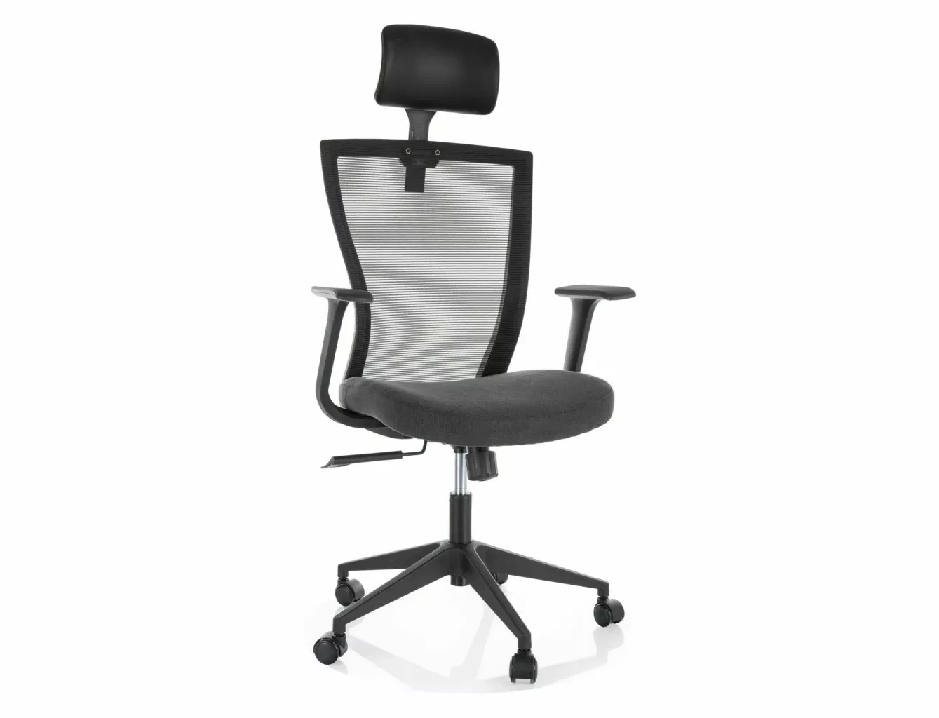 Dotaz na produkt Na splátky ještě dnesOtočné křeslo, látka/síťovina, barva: černá, plastová kostra, barva: černá, multiblok, pevné područky, nastavitelná opěrka hlavy.