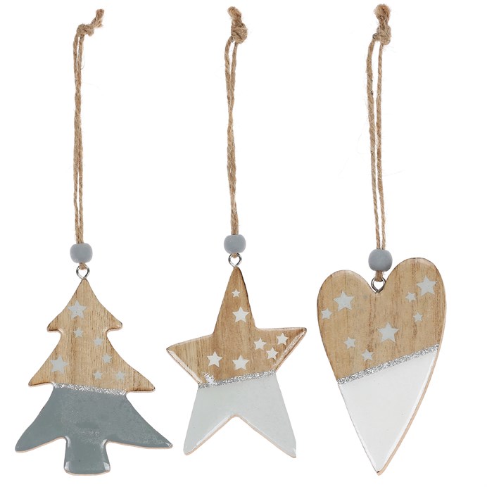 Dotaz na produktTyto kouzelné dřevěné ověsky jsou tou správnou volbou pro vaši vánoční výzdobu. V balení najdete mix tří různých tvarů a barevných kombinací, které přinášejí do vašeho domova příjemnou, útulnou atmosféru. Ověsky jsou navlečeny na provázek a každá ze zavěšených ozdob má svůj unikátní vzhled, horní polovina je v přírodní barvě dřeva a spodní je šedá až bílá. Přírodní část je krásně doplněna šedými až bělavými hvězdičkami, které dodávají ověskům elegantní a rustikální vzhled. Můžete je pověsit na vánoční stromek, na stěnu, dveře, závěs, okno a další místa, která si přejete ozdobit.