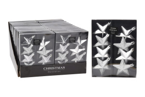 Vánoční sada obsahuje závěsné stříbrné ozdoby ve tvaru hvězdy.