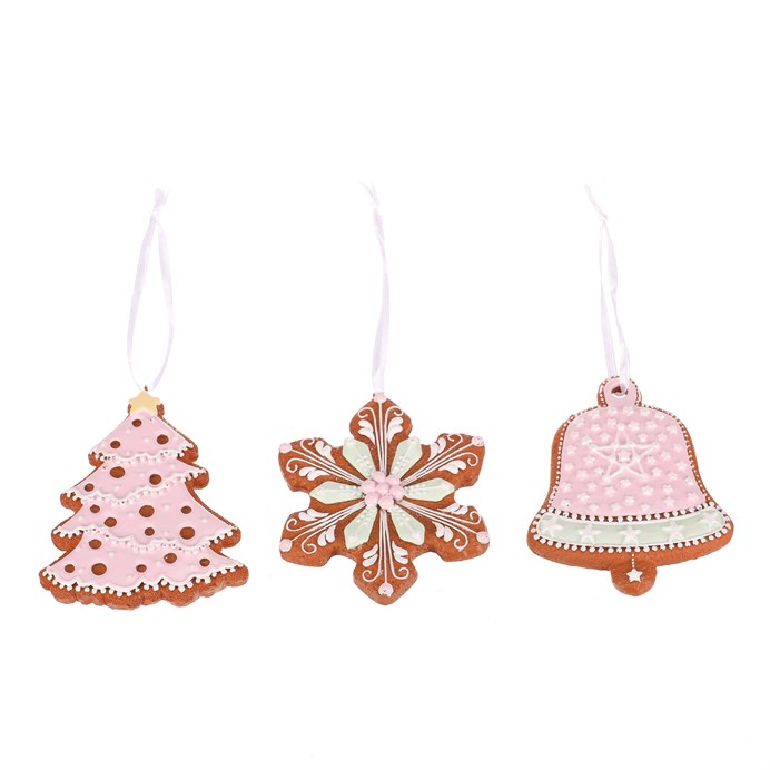 Dotaz na produktZávěsné perníkové dekorace v podobě stromku, sněhové vločky a zvonku, budou skvělou volbou pro vánoční výzdobu. Jsou sice vyrobené z polyresinu, ale vypadají skutečně jako by je upekl a vyzdobil sám mistr cukrář. Kombinace hnědé barvy s bílou, zelenou a růžovou polevou je prostě kouzelná. Jedná se o mix 3 druhů, ale cena uvedená na hlavičce produktu je za jednu ozdobu.