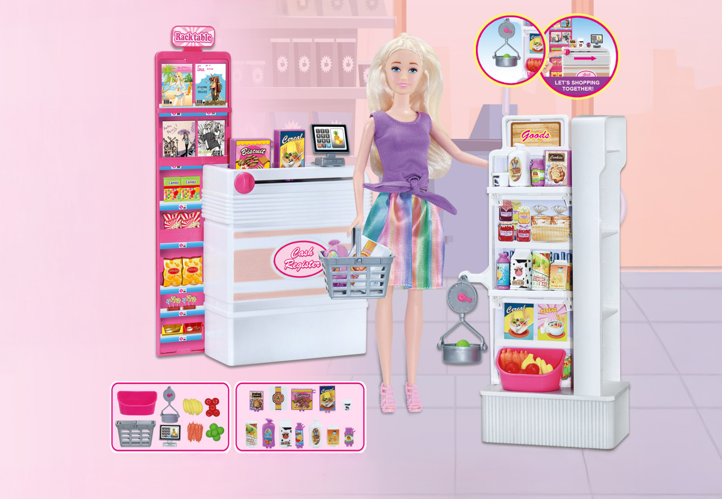 Dotaz na produktPanenka prodavačka. Velikost 30 cm. Obsahuje panenku, regál na zboží, potraviny a zboží, pokladnu s pásem, nákupní košík a další doplňky.