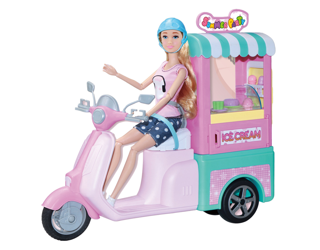 Dotaz na produktPanenka zmrzlinářka. Velikost 30 cm. Obsahuje panenku, zmrzlinářský skútr. helmu, doplňky.