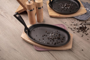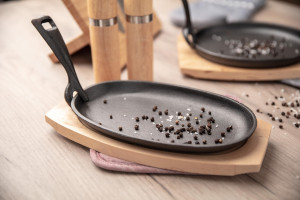 Dotaz na produktPánev 23 x 14 cm GRADA, litina + dřevěné prkénko.