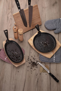 Pánev je vhodná pro zapékání pokrmů, lze jí použít pro přímé servírování, dřevěné prkénko slouží jako podložka pod horkou pánev.