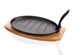 Pánev je vhodná pro zapékání pokrmů, lze jí použít pro přímé servírování, dřevěné prkénko slouží jako podložka pod horkou pánev.