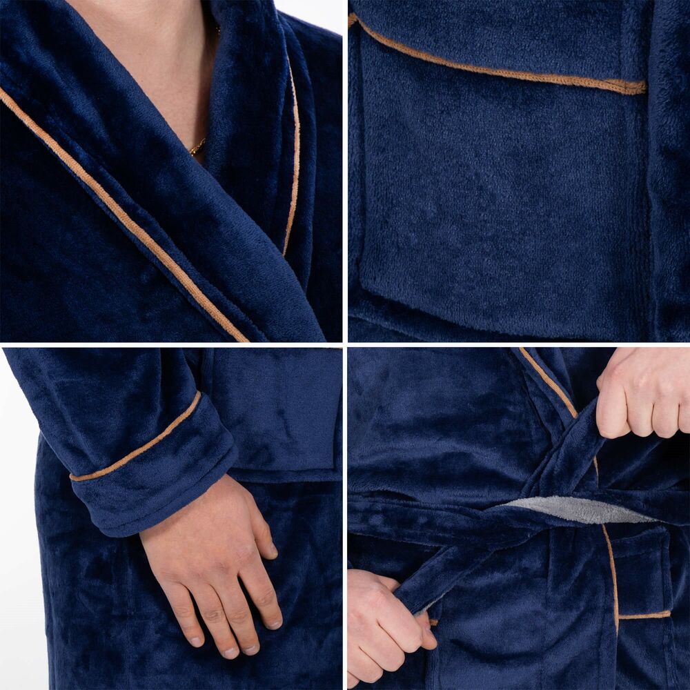 Dlouhý střih poskytuje dostatek tepla a ochrany, zatímco moderní design v elegantní modré barvě a jemným lemováním dodává na atraktivitě. Župan je perfektně navržen tak, aby splňoval nároky na komfort a funkčnost v každodenním používání.