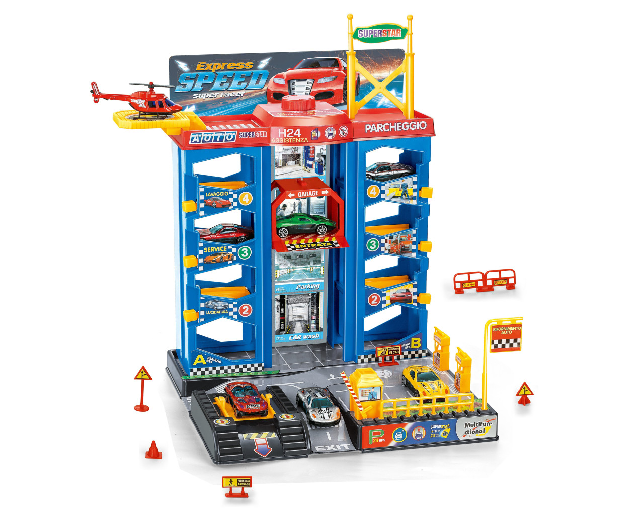 Dotaz na produktParkovací stanice se 3 kovovými auty a vrtulníkem. Rozměry 30x27x37 cm. Velikost auta 7 cm. Stanice obsahuje 3 kovová auta, 1 kovový vrtulník, ruční výtah, heliport, čerpací stanici, závoru. Posunutím páčky v daném parkovacím místě - uvolnění auta z parkovacího místa.
