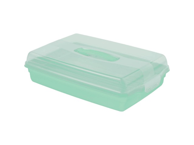 Dotaz na produktPraktický obdélný box, v kterém skladujete a přepravíte koláč nebo obložené chlebíčky. Praktické držadlo umožňuje snadno ji přenášet a použít na příklad na pikniku. Ideálně se hodí na kuchyňskou linku, do ledničky nebo do skříně. Díky boxu si všechno pečivo a svačinky zachovají svěžest déle. Výrobek je opatřen certifikátem povolujícím kontakt s potravinami.