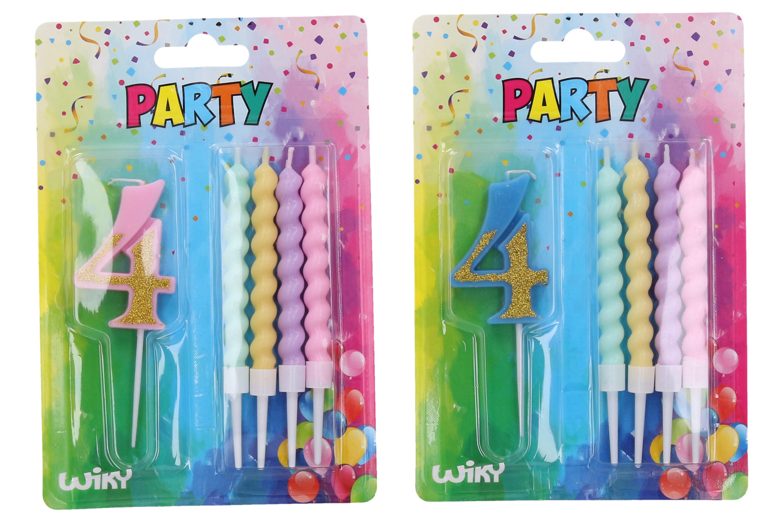 Dotaz na produktPárty svíčka číslo 4 + 4ks svíček. 2 barevné varianty - modrá, růžová.