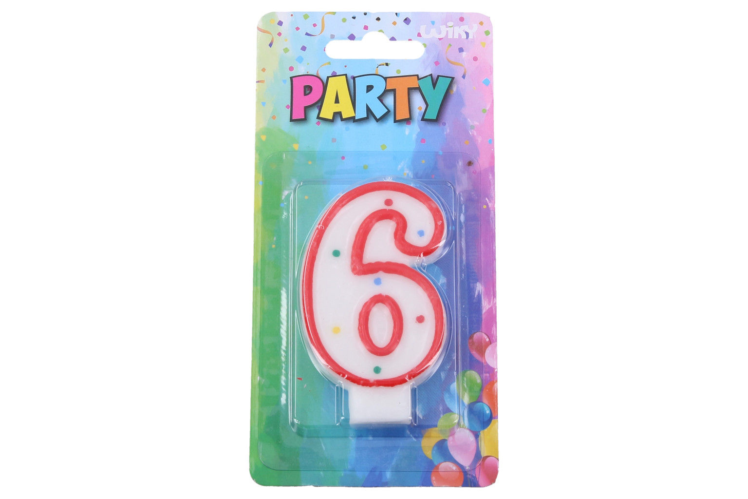 Dotaz na produktParty svíčka - číslo 6. - bílá s červenými okraji a barevnými puntíky.