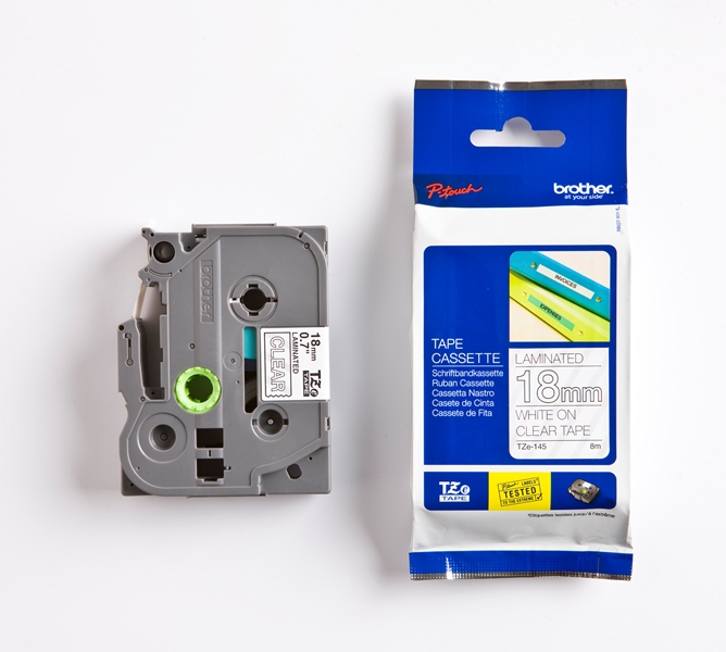 Standardní kazeta s páskou TZ/TZE-145, 18 mm x 8 m, barva průsvitná/bílá, laminovaná je určená do všech typů tiskárny štítků Brother PT. Využívá se pro výrobu šablon elektrochemického značení. TZE pásky nahrazují modely pásek TZ. Jedná se o ekologickou verzi pásek TZ.