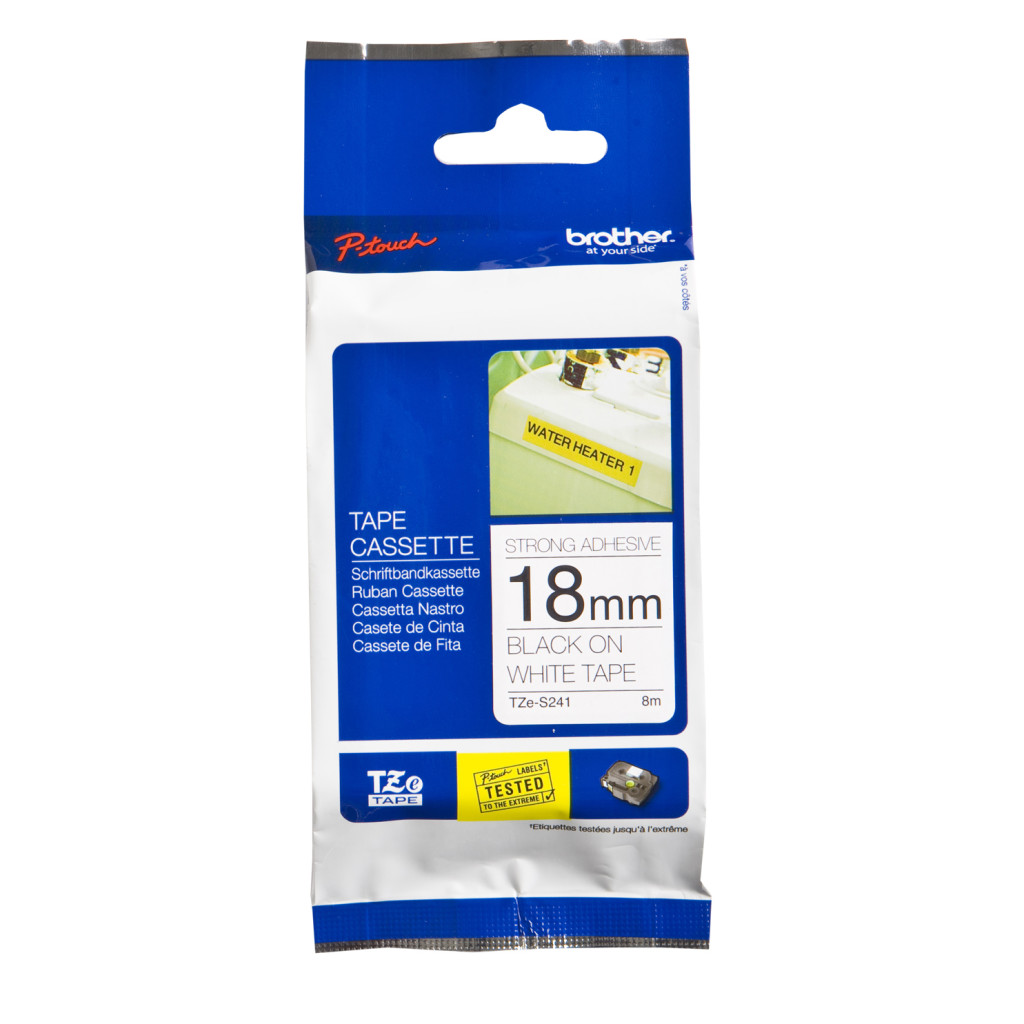 TZE-S241 kazeta s páskou, šířka 18 mm, délka 8 m, barva bílá/černá, extrémně přilnavá laminovaná, je určená do tiskárny štítků Brother P-touch. Páska je vhodná na označování tvarovaných, drsných nebo nerovných povrchů, pro denní použití v průmyslové výrobě, skladech, zdravotnických zařízeních, kancelářích atd.