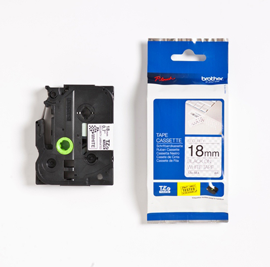 Brother TZE-SE4 speciální kazeta s plombovací páskou, šířka 18 mm, délka 8 m, barva bílá/černá, je určená do tiskárny štítků Brother. Balení obsahuje 25 kusů.