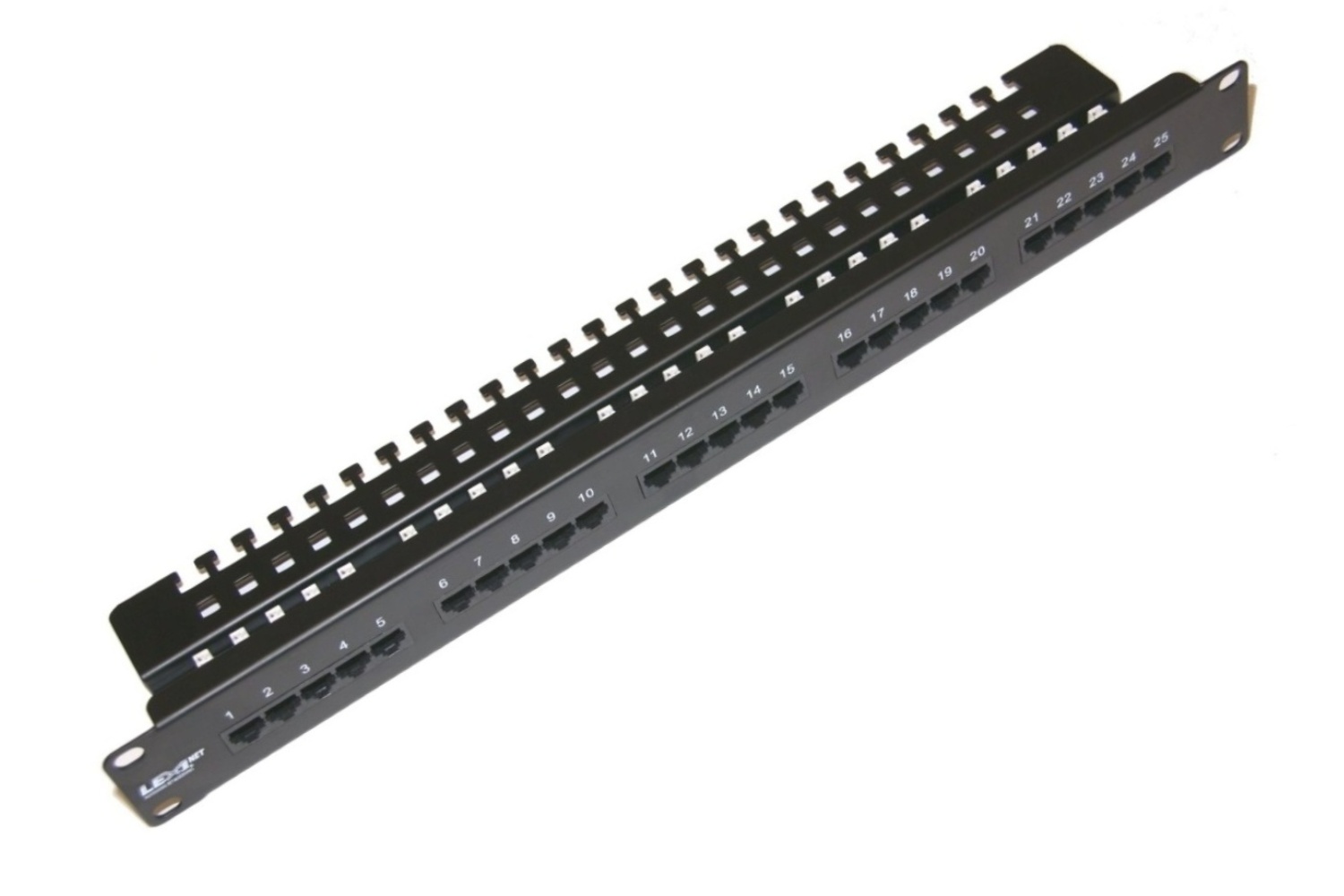 Dotaz na produktPatch panel 25 port telefonní 1U 19" s pomocnou vyvazovací poličkou a horním zářezem. Zářezové svorkovnice typu "LSA". 19" Patch panel ISDN 25 port cat.3 RJ45 s osazením pinů 3,4,5,6 nestíněný 5 pozic zářezového pole typu LSA (krone) výška 1U barva černá