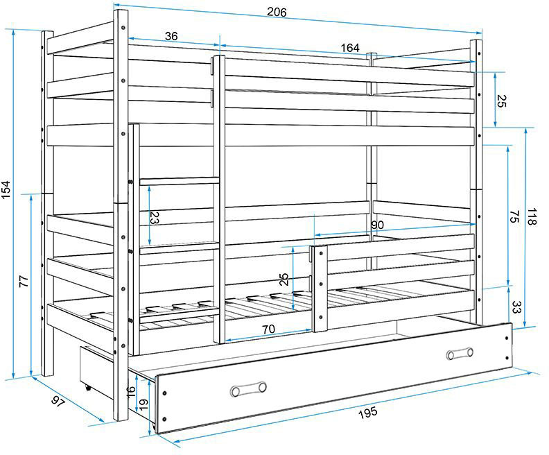 Patrová postel s úložným prostorem, která obsahuje 2x matraci a 2x rošt. Idealní volba do dětského pokoje, díky zábraně ochrání Vaše dítě proti možným pádům z postele.