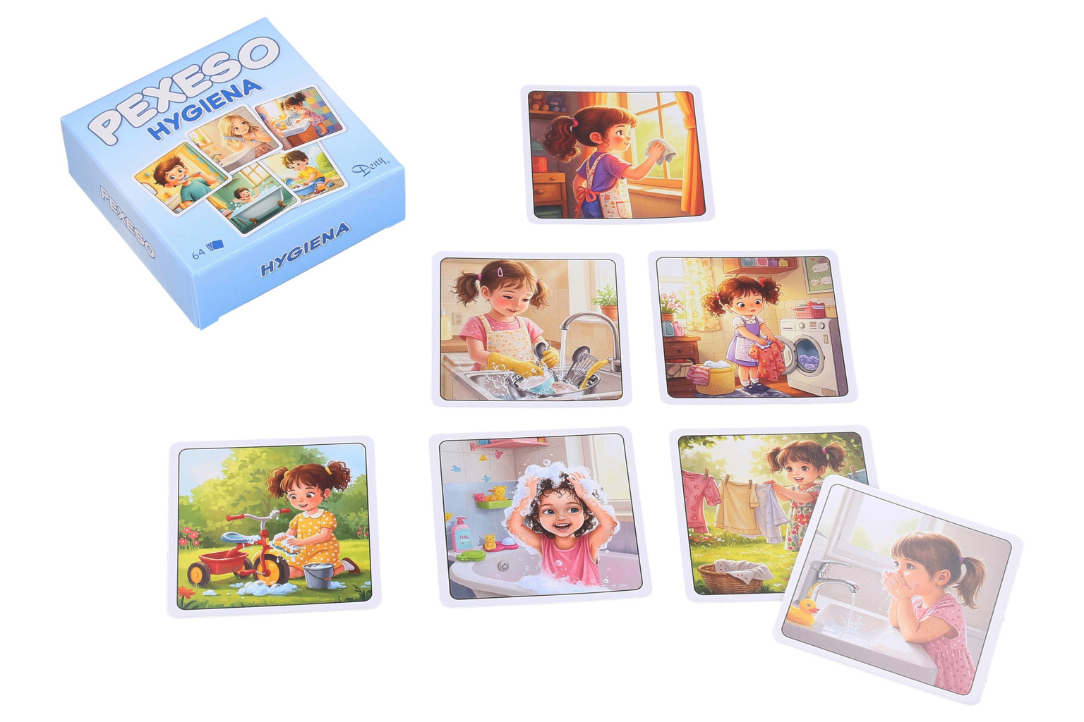 Dotaz na produktPexeso Osobní hygiena. Balení obsahuje 64 karet (32 párů) + 2 karty s pravidly. Rozměr krabičky 8x8x2,5 cm.