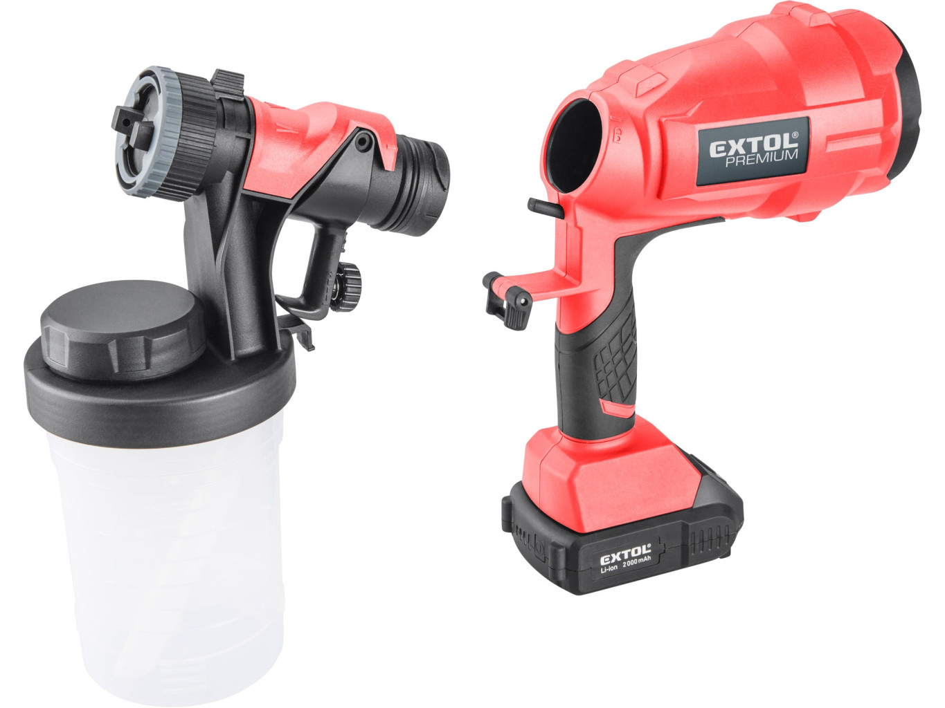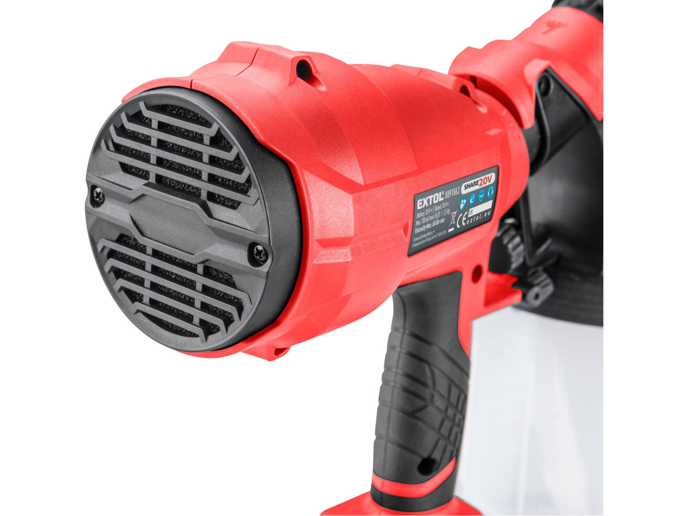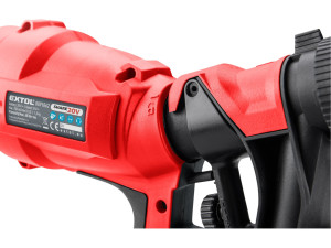 Dotaz na produkt Na splátky ještě dnesHVLP aku stříkací pistole je ideální pro stříkání barvy doma, na chalupě či v zahradě. Vyšší výkon jí dovoluje používat hustější typy barev nebo méně ředěné barvy, čímž je možno zrychlit práci. Stříkací pistole umožňuje regulovat množství nanášené barvy a má 3 tvary nanášejícího paprsku — horizontální a vertikální paprsek a kruh/bod. Lze použít pro nanášení těchto barev a tekutin: plastických a latexových barev, vodou ředitelných barev, základových a emailových barev, barev na bázi oleje nebo hliníku, krycích laků, uzavíracích nátěrů pro automobily nebo dřevo, mořidel, konzervantů na dřevo, prostředků na ochranu dřeva a rostlin, desinfekčních prostředků. Nádoba na barvu má objem 900ml a díky jejímu designu lze doplňovat barvu bez její demontáže. Pogumovaná rukojeť je příjemnější, lépe se drží a zmenšuje únavu při práci. Pro běžnou práci dostačují jeden nebo dva 2000mAh akumulátory, které můžete rychle nabít v rychlonabíječce, pro náročnější nebo delší práci doporučujeme větší akumulátory s kapacitou 4000–8000mAh. Akumulátor lze použít ve všech typech nářadí řady EXTOL SHARE20V. Díky použité Li-ion technologii je ho možné kdykoliv dobíjet, aniž by se tím snižovala jeho kapacita. Li-ion akumulátor ztrácí energii vlivem samovybíjení velmi pomalu a vydrží dlouho nabitý a připravený k použití.