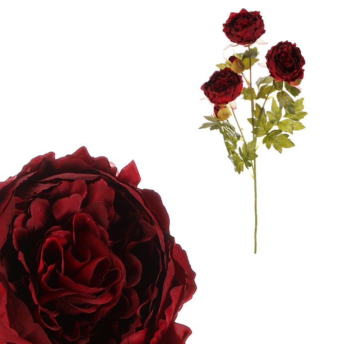 Dotaz na produktUmělá řezaná pivoňka s bohatými tmavě červenými květy a jemnými poupaty vypadá jako právě natrhaná ze zahrady. Realisticky zpracovaný stonek s lístky dodává rostlince přirozený vzhled, díky kterému krásně vynikne samostatně ve váze, ale může být součástí i větších květinových kompozic. Nadčasová dekorace, která si uchová svou krásu napořád a vnese do interiéru i venkovních prostor nádech romantiky.