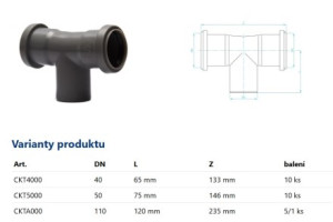 rozměr DN50/50/50Vlastnostimateriál PP (polypropylen)pro kanalizační systémy uvnitř budovPARAMETRY:Druh tvarovky: plastová hrdlováModel tvarovky: HTDBPoužití tvarovky: odpadPrimární materiál...