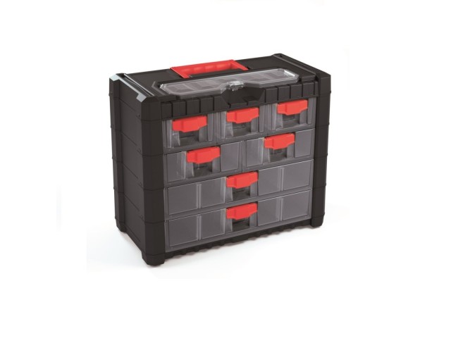 Základní vlastnosti:*rozměr 400 x 200 x 326 mm*barva černá s transparentními boxy a červenými úchyty*box má 3 různé velikosti zásuvek (3x 185x100x65 mm, 2x 185x160x65 mm a 2x 185x325x65 mm)*je opatřen i organizérem na horní části
