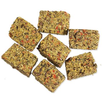 Kukuřice, pšenice 20,1%, mrkev, lněné semínko, pampelišky 7,3%, proso la plata 6,6%, arašídy 6,6%, řepkový olej, proso manna, hrachový škrob, slunečnicová semena (suroviny v sušeném stavu).