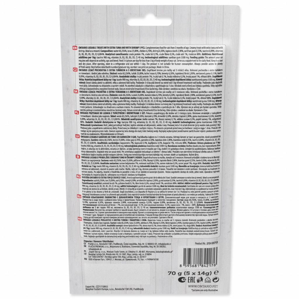 Ontario lízací pochoutka přichází v praktickém balení pěti tub po 14g, které udržují pastu čerstvou a připravenou k podání. Můžete ji podávat přímo z tuby, na lízací podložku či do jiných interaktivních hraček nebo ji použít ke zlepšení chuti suchého krmiva, pokud ho vaše kočka odmítá.