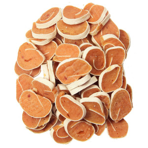 Složení: kuřecí maso 87%, maso z tresky 10%, kukuřičný škrob 2%, glycerin 1%.