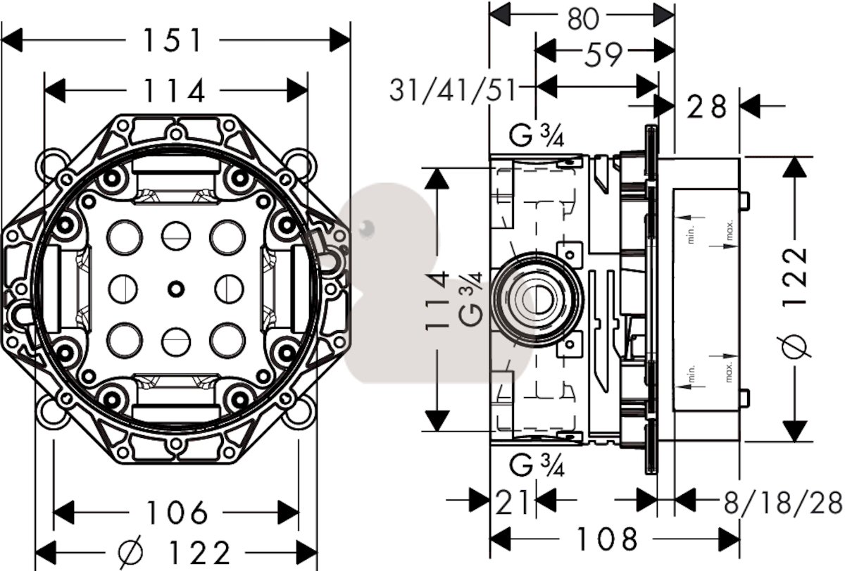 Jednoduchá montáž: iBox universal je symetrické konstrukce. Všechny přívody jsou shodné – důležité je jen to, aby byla studená voda připojena vpravo a teplá voda vlevoŘešení na tenké a silné stěny: k dostání jsou také vyrovnávací rozety (standard 80 mm až 108 mm )Vodotěsnost: speciální těsnicí manžety chrání zeď ze všech stran dokonale před vlhkostíZvuková izolace: funkční blok se do boxu iBox universal uloží tak, aby se zvuky z částí, kterými protéká voda, nepřenášely do zdiva ani na obkladyBezpečné používání odpovídá celosvětově běžným normám a během let se dokonale osvědčilo v sanitární oblastiUniverzální podomítková instalace: osvědčené základní těleso pro všechna standardní řešení a řešení s termostatem od hansgroheŠiroké využití: jednotné základní těleso pro více než 200 vrchních sad hansgroheSnadnější modernizace: Funkční blok základního tělesa a vrchní sadu lze bez problémů vyměnit, aniž by bylo třeba sekat do zdiVhodné pro všechny běžné instalační technologie, způsoby připojení a spojovací materiálTichý provoz: Vestavěný tlumič hluku redukuje šum proudění vody – pro extra tichý provoz.Integrovaná ochrana před vlhkostí, krabice iBox je absolutně vodotěsná. Těsnění chrání zdivo před vlhkostíRotačně symetrická vestavba: všechna připojení mají stejné provedení. Chyba při nastavení polohy je vyloučenaSe zpětným ventilem a provzdušňovačem potrubí: v případě podtlaku brání pronikání užitkové vody do vodovodního vedení pitné vody (pojistná kombinace)Součásti dodávky: základní těleso, nastavitelný upínací kroužek, těsnicí příruba, montážní návodVšechny součásti jsou vyrobeny z vysoce kvalitních materiálů – pro větší bezpečnost a dlouhodobé užívání v domácnosti.Historie hansgrohe od roku 1901 – prémiová značka výrobků pro koupelnu a kuchyňProdloužená pětiletá záruka* na produkt, vyrobený podle nejvyšších kvalitativních standardů *(viz www.hansgrohe.cz/zaruka)PARAMETRY: