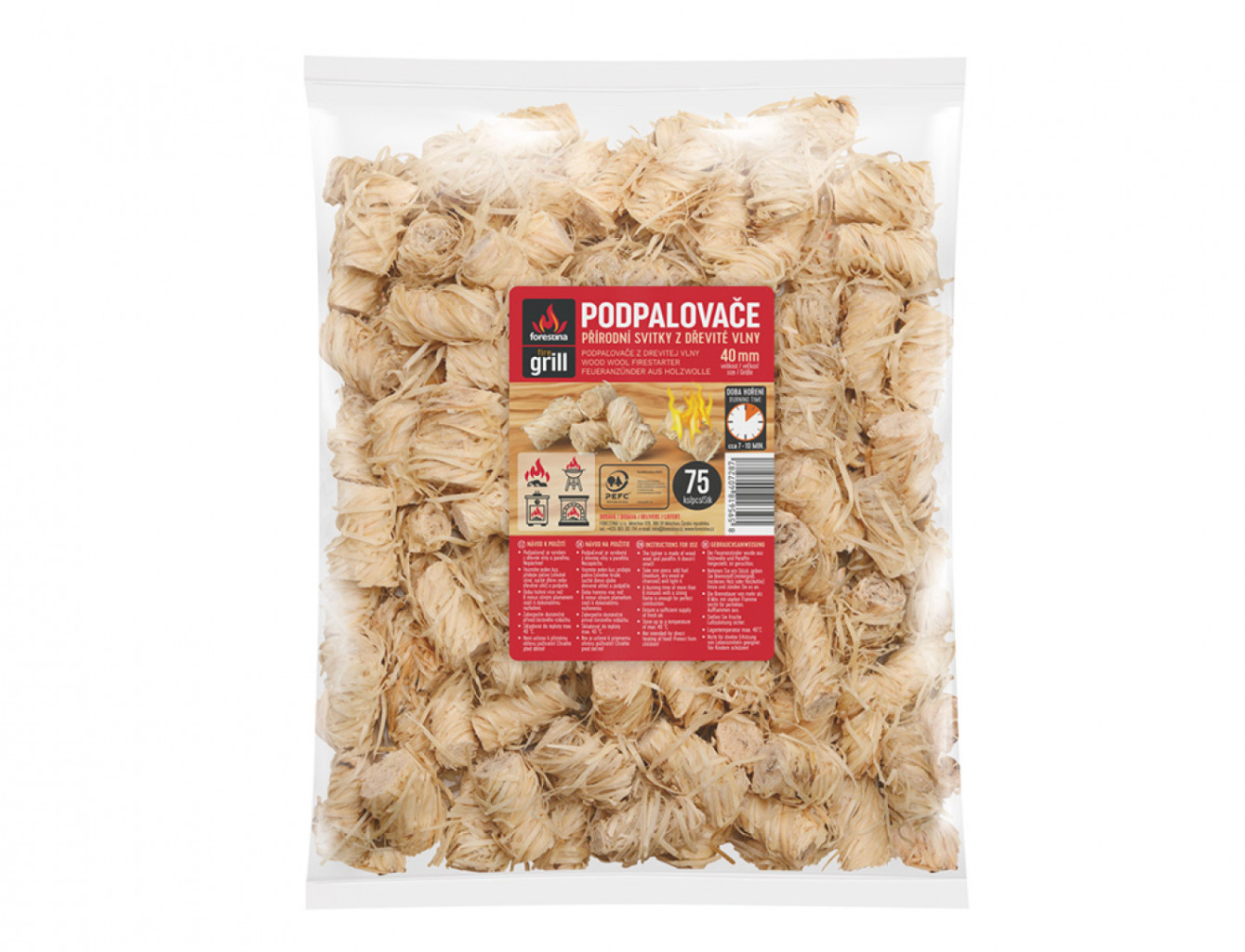 Dotaz na produktPodpalovač je vyroben z přírodních svitků z dřevité vlny a parafínu. Použití: jeden svitek se podpálí spolu se středně silným, suchým dřevem nebo dřevěným uhlím. Doba hoření je více než 8 minut, silným plamenem, což stačí k dokonalému rozhoření. Velikost: 4 cm. Počet kusů v balení: 75.