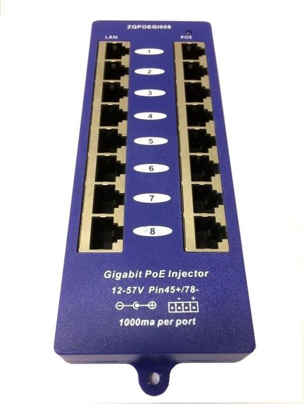 Panel integrující osm gigabitových pasivních POE injektorů s napájecím rozsahem 12 - 57 V a max. proudem 1 000 mA/port slouží jako univerzální řešení pro vzdálené napájení většího počtu aktivních prvků s integrovaným extraktorem po UTP kabeláži.