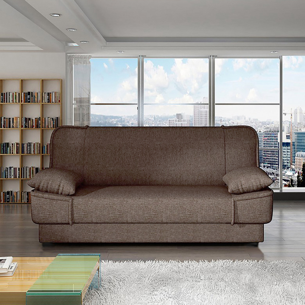 Dotaz na produkt Na splátky ještě dnestextilní potah, barevné provedení hnědá jádro z vlnité pružiny, výška sedu 40 cm, hloubka sedu 55 cm, rozměr rozložené 190 × 120 cm rozkládací s úložným prostorem, rozkládání KLIK-KLAK (postup uveden v návodu k montáži) po složení do polohy k sedu upravte krycí látku v zadní části tak, aby zakryla rozkládací mechanizmus