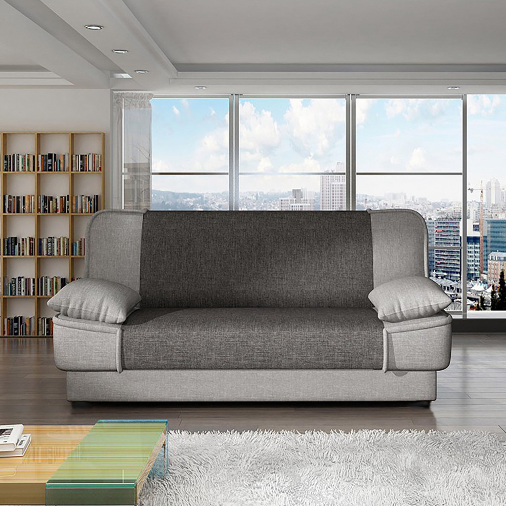 textilní potah, barevné provedení světle šedá / šedá jádro z vlnité pružiny, výška sedu 40 cm, hloubka sedu 55 cm, rozměr rozložené 190 × 120 cm rozkládací s úložným prostorem, rozkládání KLIK-KLAK (postup uveden v návodu k montáži) po složení do polohy k sedu upravte krycí látku v zadní části tak, aby zakryla rozkládací mechanizmus